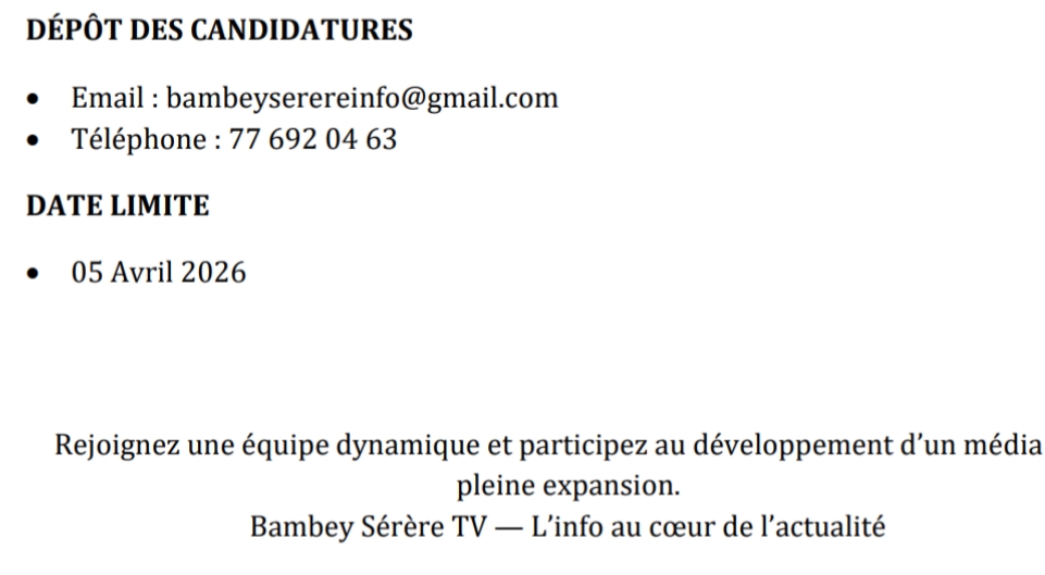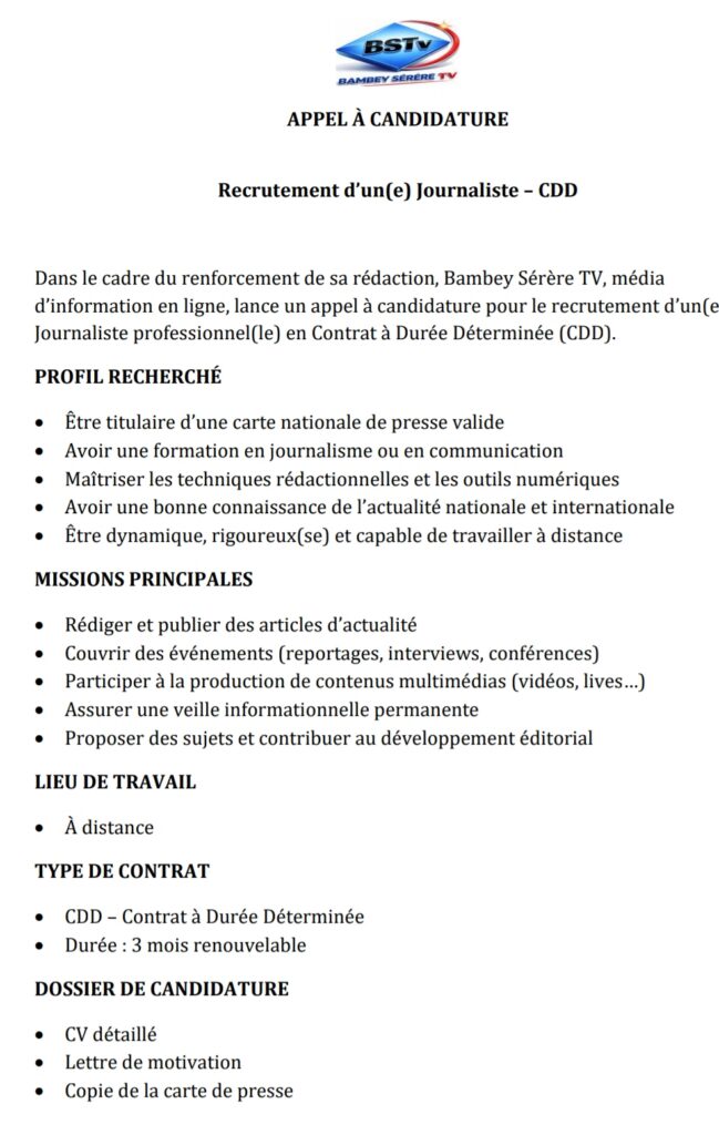 Bambey Sérère TV recrute un(e) journaliste en CDD