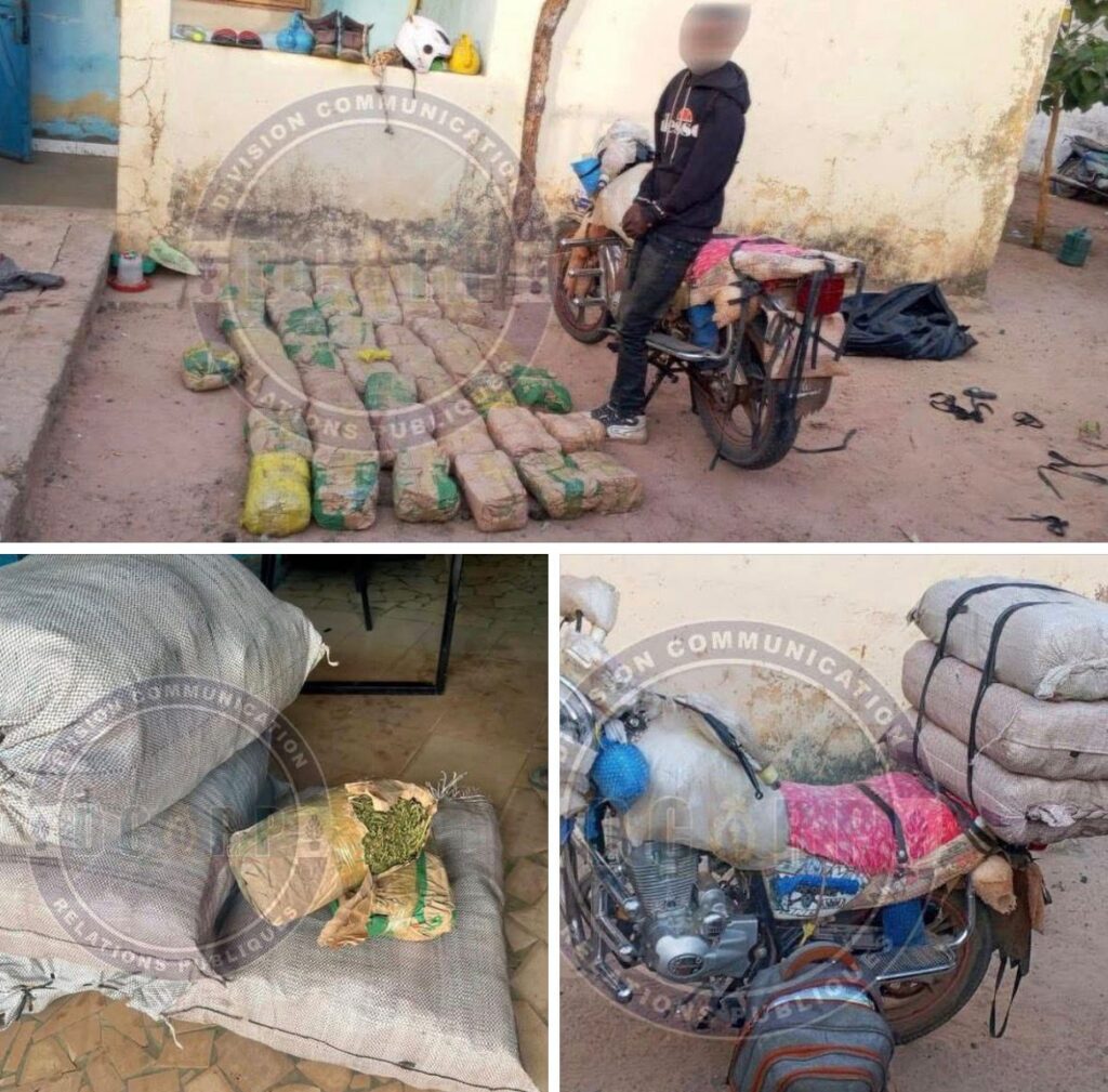 Après une course-poursuite, les gendarmes sont parvenus à interpeller l’un des fugitifs. Lors de la fouille, les éléments ont découvert un sac contenant quarante-trois (43) kilogrammes de chanvre indien, confirmant des faits présumés de détention et de trafic de stupéfiants.